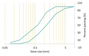 | Particle-size distribution (PSD) | < 25% silt- and clay-sized particles (smaller than 0.05 mm) combined; 3 to 12% clay-sized particles (0.002 mm or smaller) |
