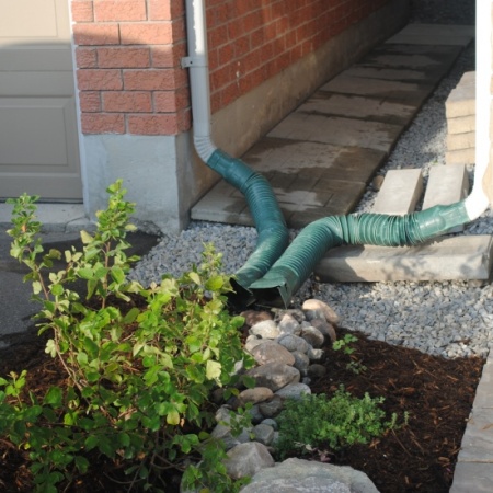- A splash pad of rocks to prevent the downspout flow from eroding the soil