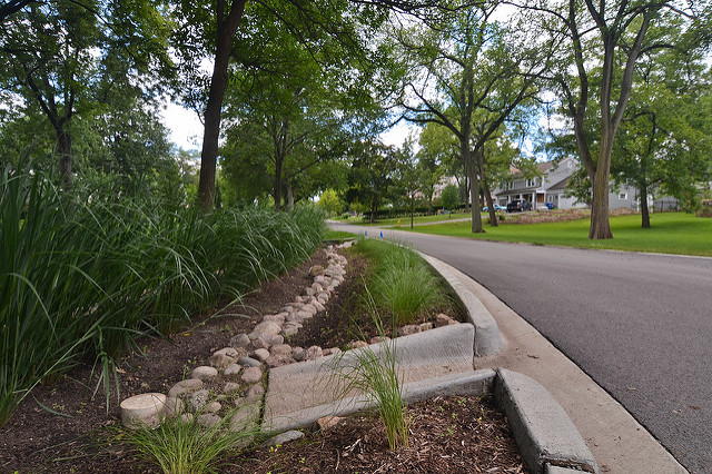 Curb cut into a bioretention facility in Hinsdale, IL. Decorative aggregate in the center of the facility reduces erosion and dissipates power inflow around the inlet area. A monitoring/maintenance well can be seen in the foreground. Photo credit: CNT