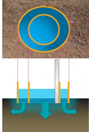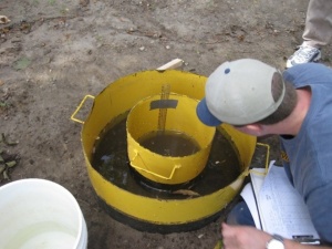Using a double ring infiltrometer is a relatively simple (although slow) method of measuring soil the hydraulic conductivity or design infiltration rate of a soil.