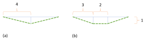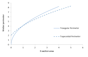 At lowest flow rates (smallest area) the trapezoidal swale (b) has the greater wetted perimeter; at higher flow rates (greater area) the triangular geometry (a)has a larger wetted perimeter for same area. Both channels modelled using ratios shown in figure above