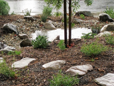 This rain garden in a school yard uses stone as both decorative edging and for erosion control.