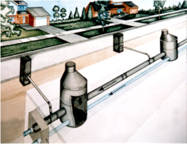 A pair of perforated pipes can be seen in this manhole during cleaning operations. Four connections in total as this manhole is part-way along the system.