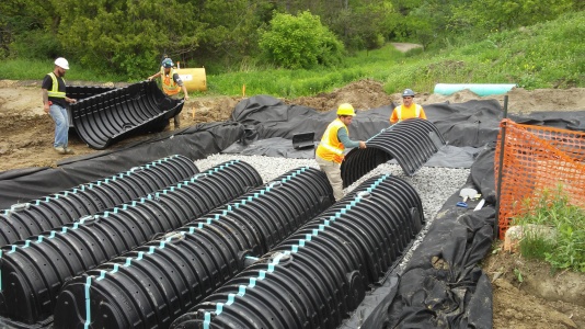 As their name suggests infiltration chambers work exclusively to infiltrate stormwater. They are an underground facility and are often used beneath parking lots or playing fields to treat flow routed from other areas.