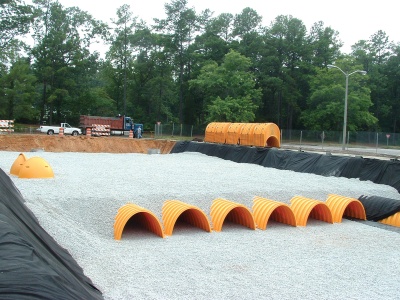 • Plastic chambers usually have a parabolic shape to support the load above. The spaces between rows of plastic pipes or chambers are filled with clear stone to support overlying structures.