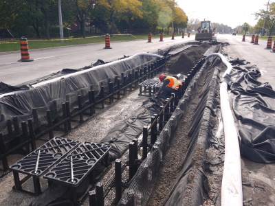 These are (usually plastic) supporting structures placed around the trees and beneath adjacent paved areas. They prevent compaction to the roots of the tree and prevent root damage to the paving. They are sometimes configured to receive stormwater and to enclose ponded water which can then infiltrate the soil surrounding the tree. Things to consider in design: